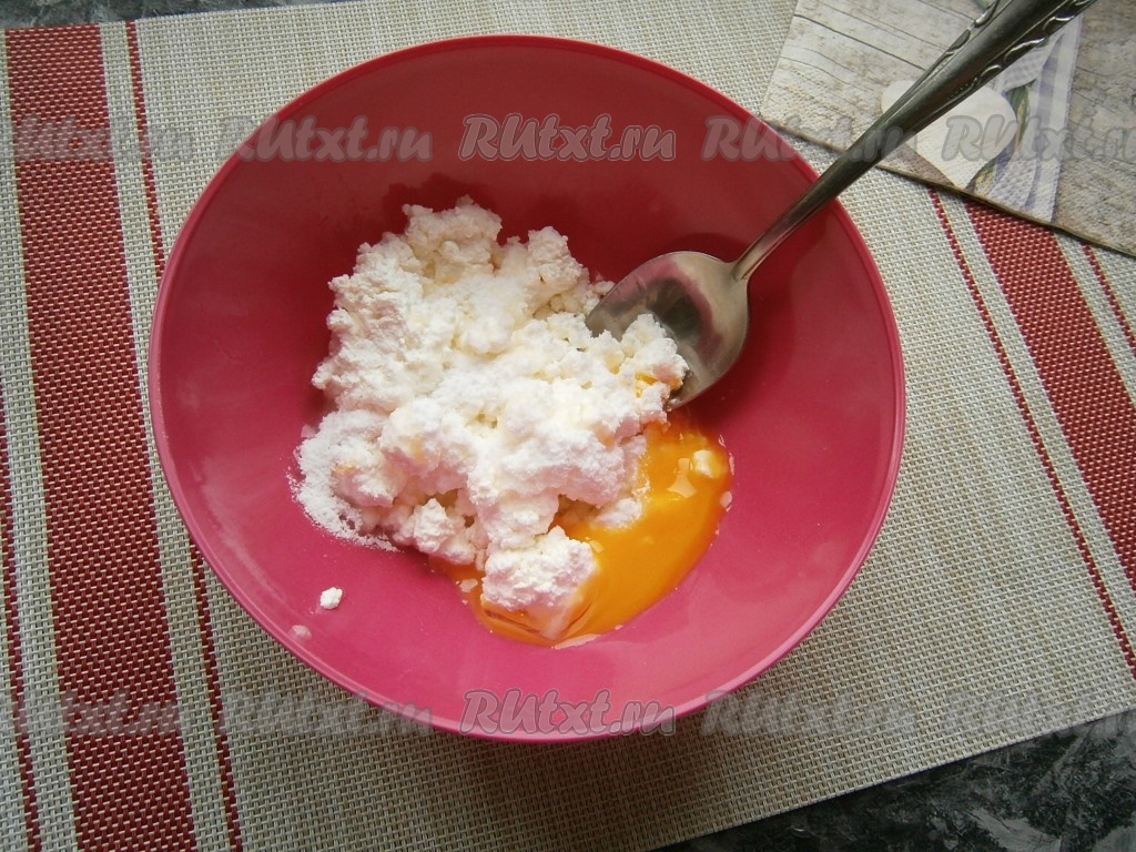 Яйцо разделить на желток и белок (желток добавим в тесто, а белок будем использовать для смазывания коржиков). В отдельную посуду выложить желток, добавить к нему творог и всыпать сахарную пудру, тщательно перемешать, чтобы не было крупных комочков творога.