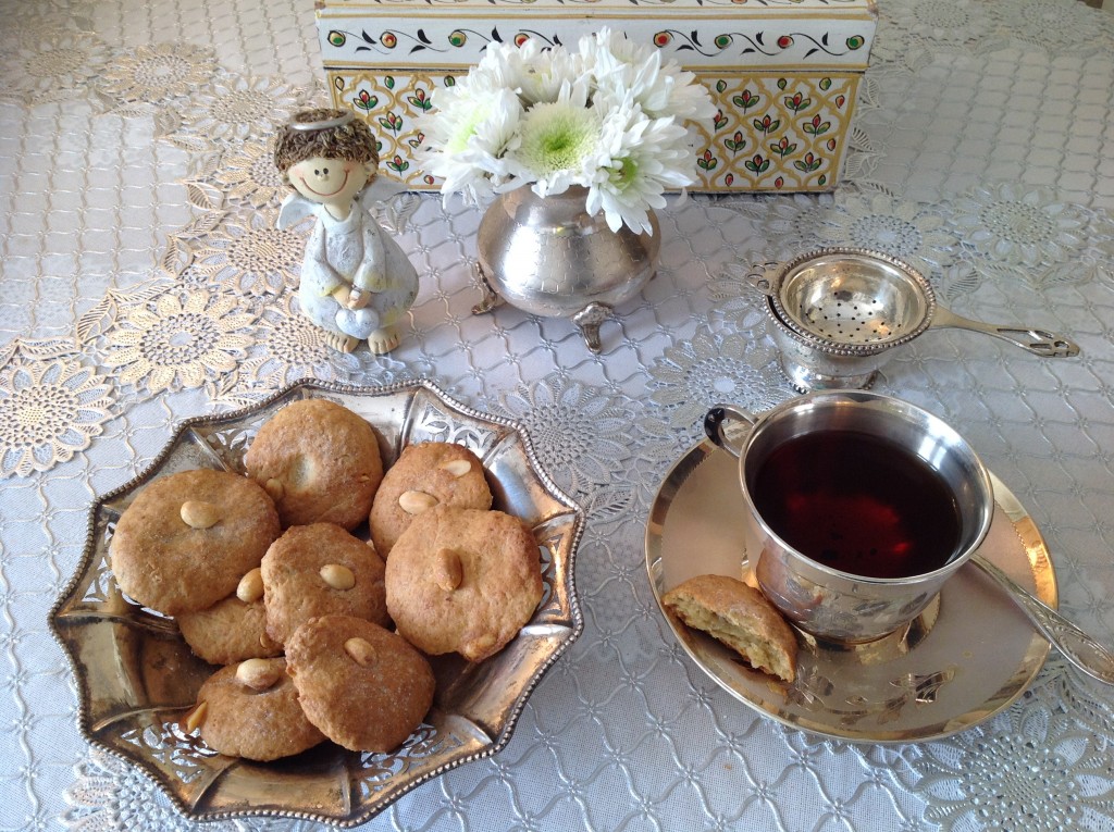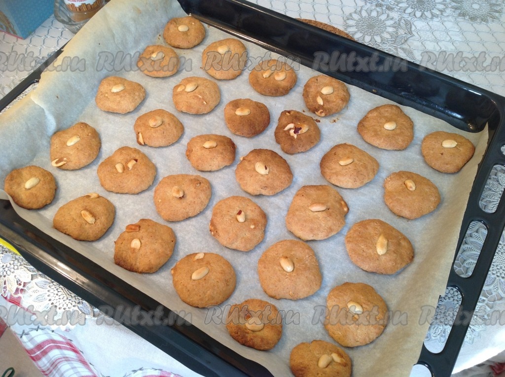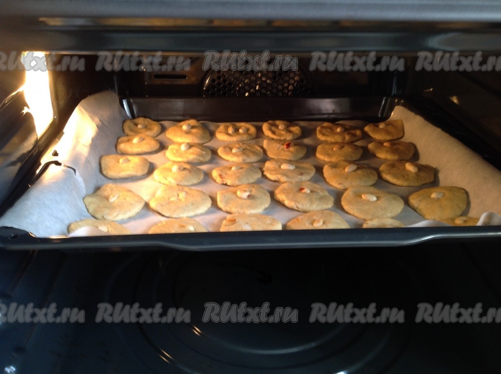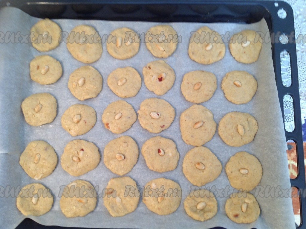 Выложить шарики на пергамент, слегка придавливая. Можно сверху на каждую печеньку положить орешек.