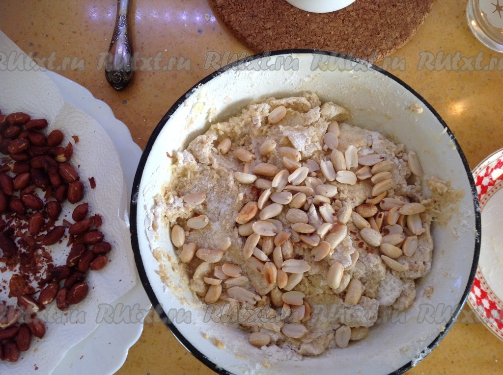 Добавить орешки в тесто, предварительно сняв оболочку с орехов.
