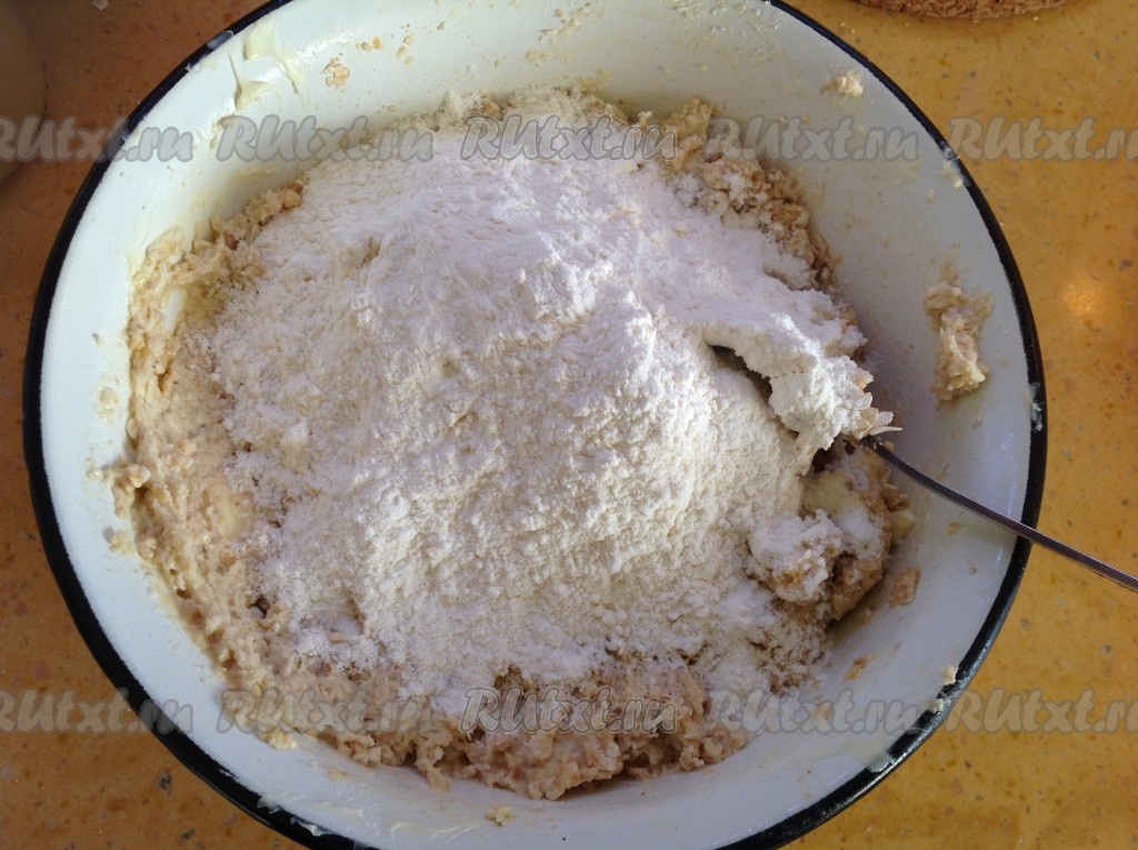 Теперь добавить муку и ещё раз перемешать.
