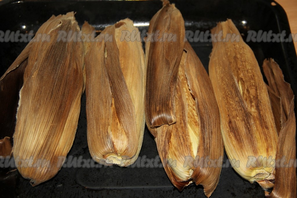 Духовку предварительно разогреть до 180 градусов. Кукурузу выложить на противень для запекания. Листья с кукурузы не удалять! Благодаря листочкам, она сохранит свою сочность в процессе запекания.