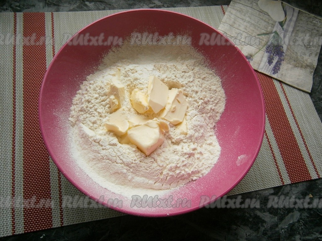 Вначале замесим тесто, для этого муку нужно просеять в миску, добавить кусочки холодного сливочного масла.