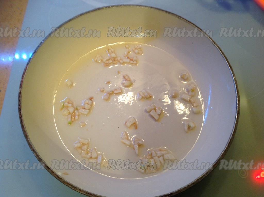 Ставим сковородку на огонь, наливаем немного подсолнечного масла и выкладываем нарезанный чеснок, обжариваем его на небольшом огне, периодически помешивая.