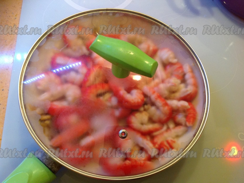 Перемешиваем наши морепродукты и накрываем крышкой. Оставляем жариться, примерно, 5-7 минут на среднем огне, периодически помешивая.