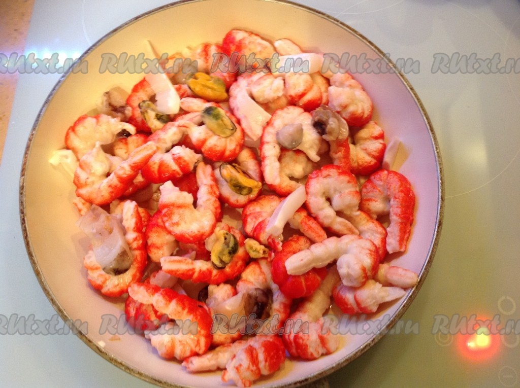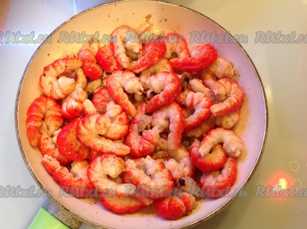 Чесночок обжарился, удаляем его и выкладываем на сковородку морепродукты.