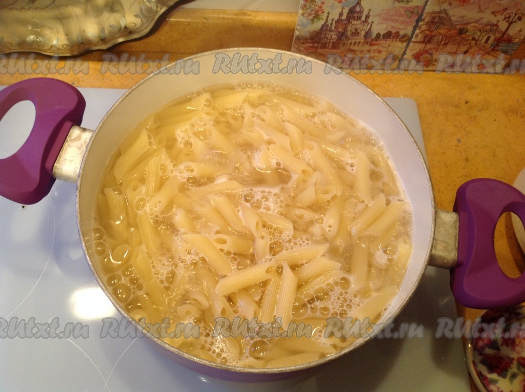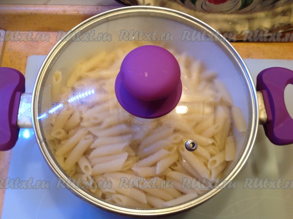 Варим пасту на среднем огне в течение времени, указанного в инструкции на упаковке (у меня - 9 минут).