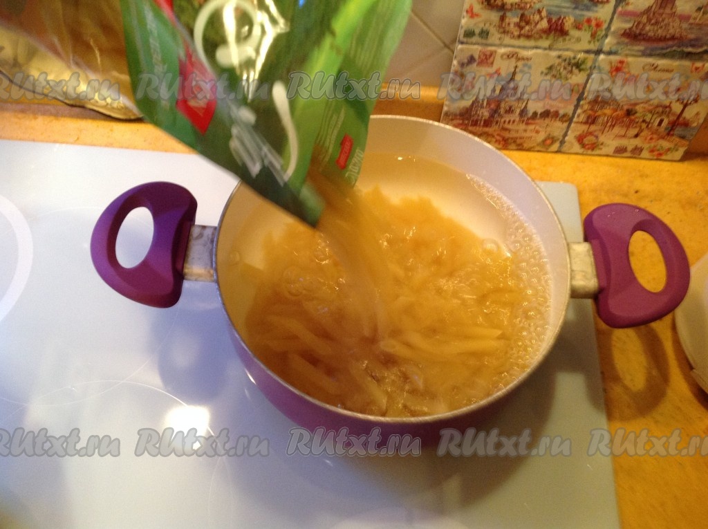 Тем временем закипела вода в кастрюле. Высыпаем пасту в кастрюлю.