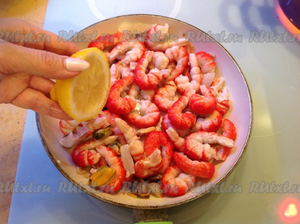 Сбрызгиваем морепродукты соком лимона.