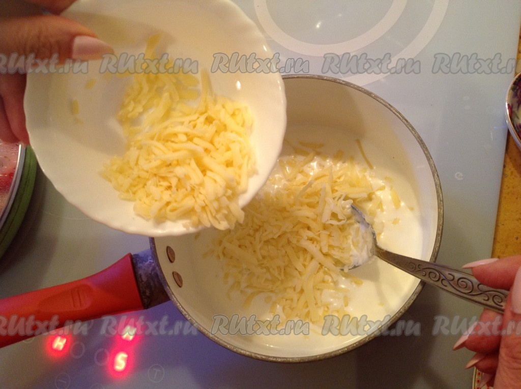 Начинаем готовить соус, для этого 50-80 грамм молока наливаем в ковшик, ставим на средний огонь, добавляем сметану, солим, высыпаем натёртый сыр и перемешиваем.