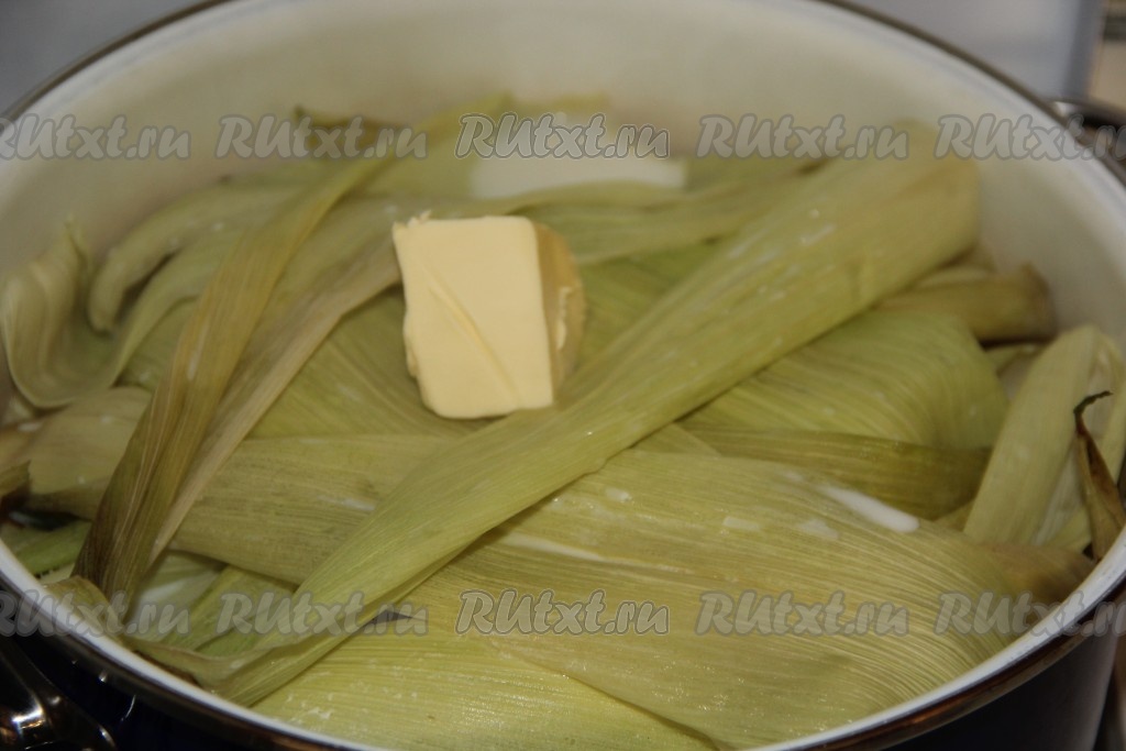 Затем положить кусочек сливочного масла на листочки и варить кукуруза в молоке ещё 10 минут. За это время зёрна кукурузы станут мягкими.