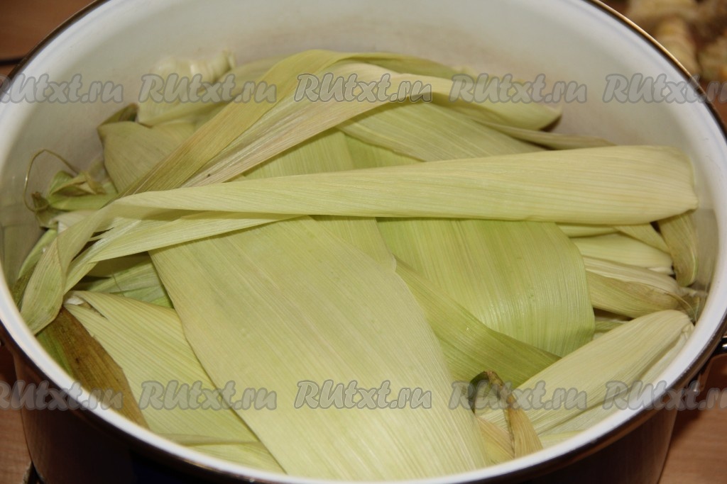 Часть листьев выложить на дно кастрюли. Если нет листьев, можно сварить кукурузу в молоке и без них, но с ними блюдо получается особенно вкусным и ароматным.