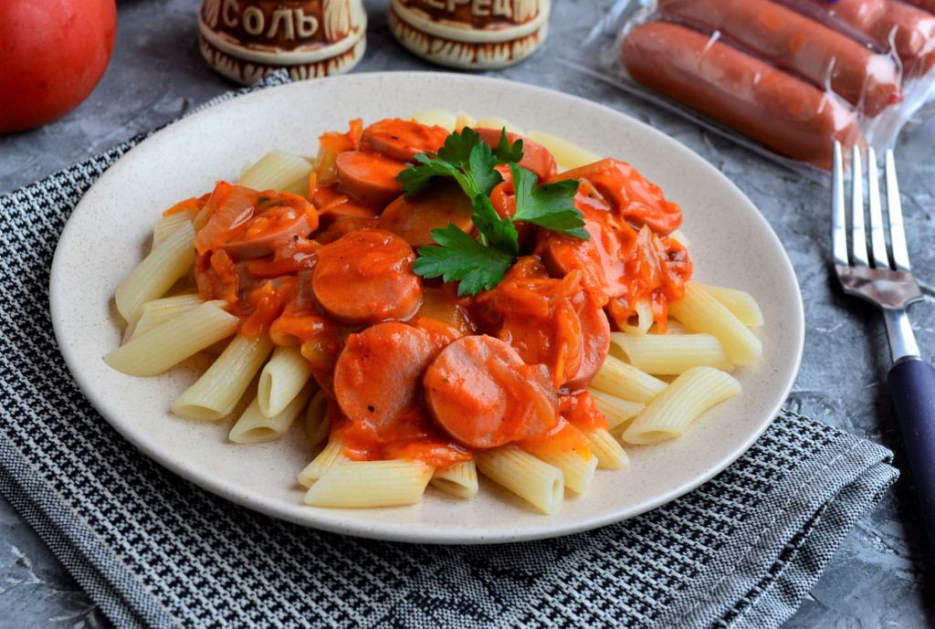 На макароны, отваренные в соответствии с инструкцией на упаковке, выложить аппетитную подливу, приготовленную из сосисок с томатной пастой, и сразу подать к столу. Это простое блюдо и насытит, и порадует прекрасным вкусом, попробуйте!