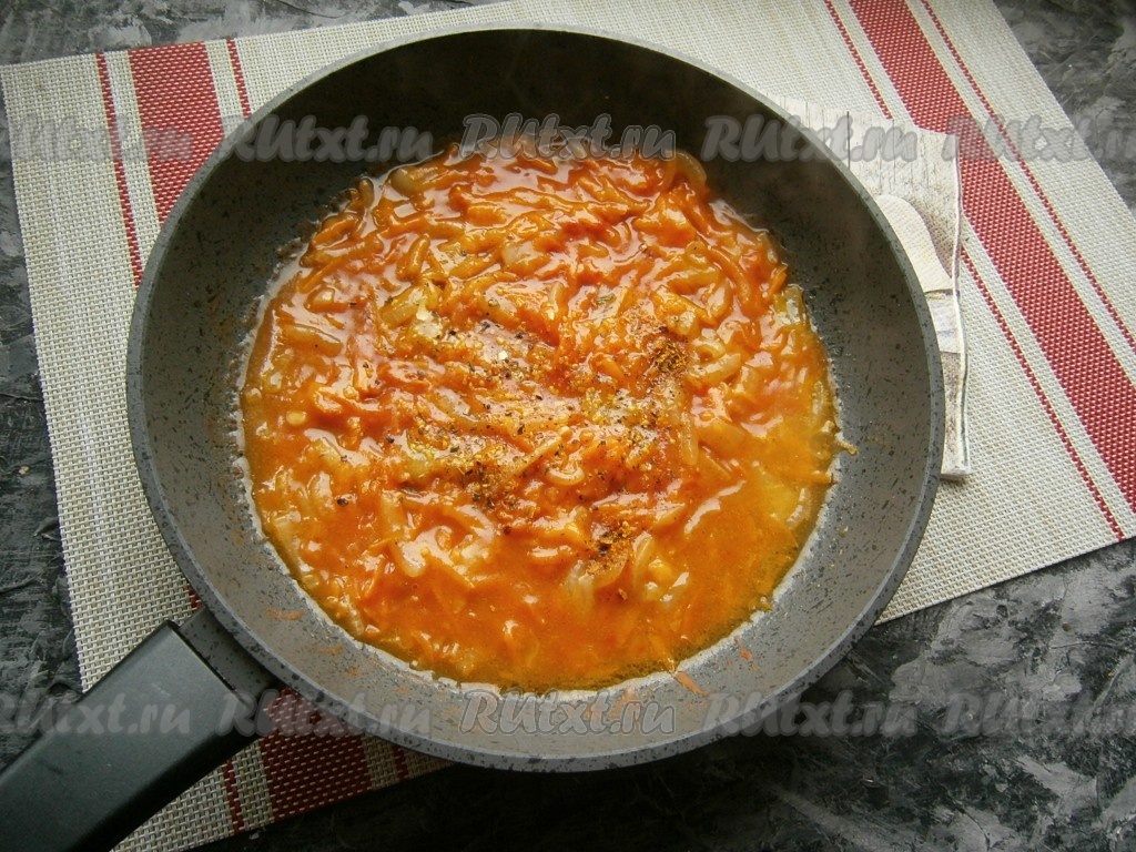 Тщательно перемешать содержимое сковороды, посолить, всыпать 1 чайную ложку сахара, посыпать чёрным молотым перцем и специями, перемешать получившийся томатный соус.