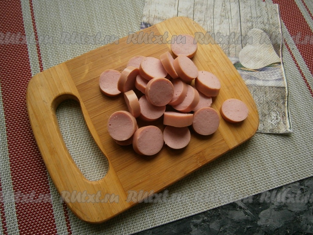 Очистить лук, чеснок и морковь. Нарезать сосиски кружочками толщиной, примерно, 0,5 см.