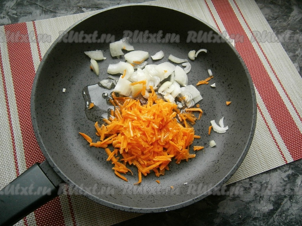 На крупной тёрке натереть морковку, нарезать произвольно лук и выложить в сковороду, разогретую с растительным маслом.