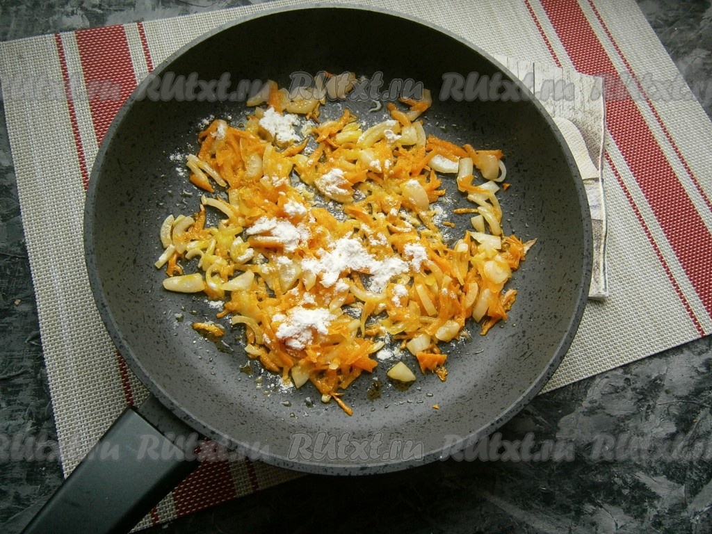 Обжарить лук с морковью на среднем огне, помешивая, в течение 3-4 минут (до мягкости овощей), затем посыпать мукой и хорошо перемешать.