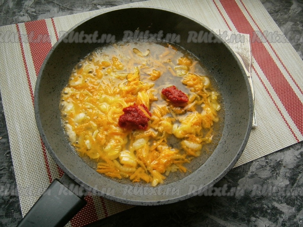 К обжаренным овощам добавить томатную пасту и влить горячую воду (или бульон).