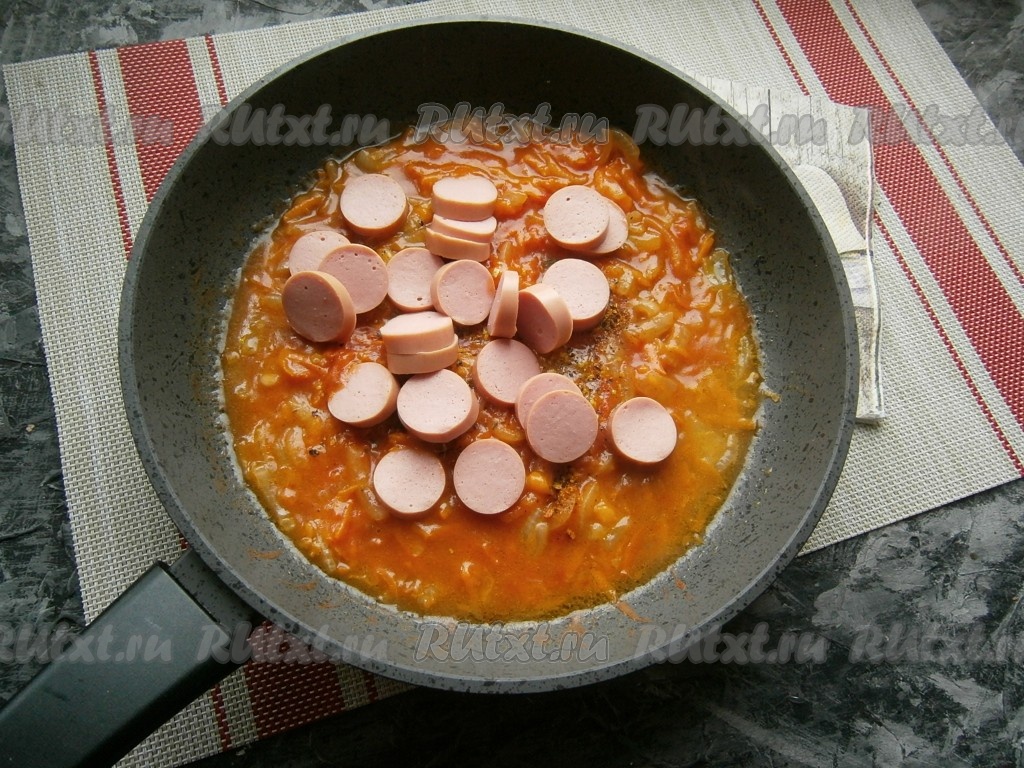 Выложить сосиски в сковороду с томатным соусом.