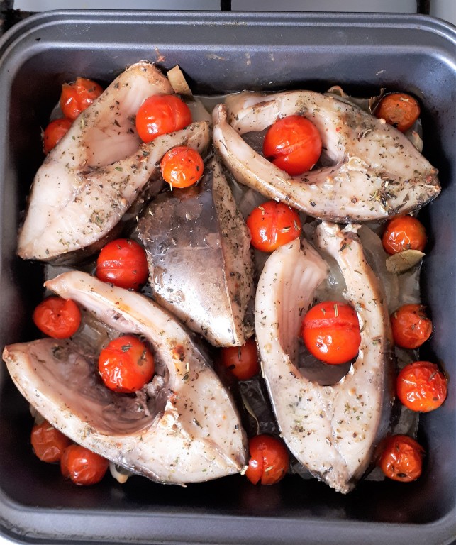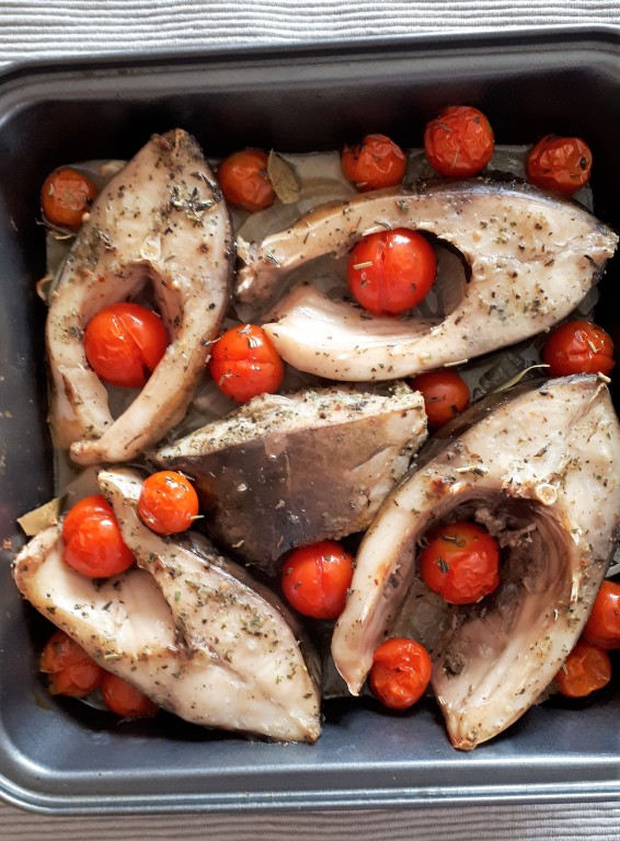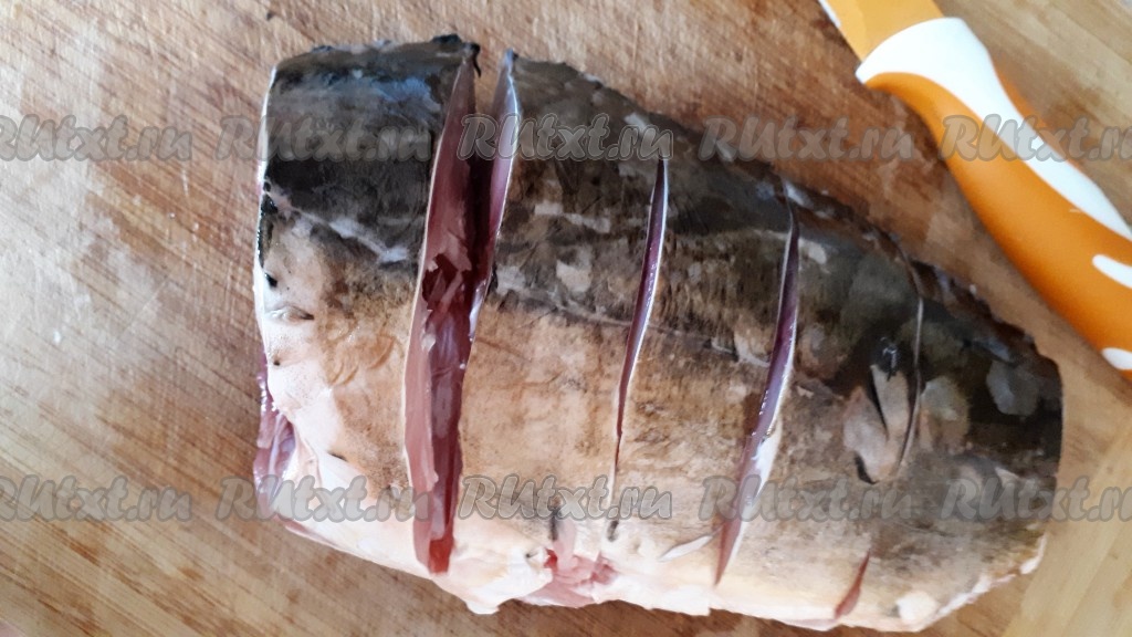 Отрезать голову, хвост, плавники (хвост, голову и плавники можно использовать для приготовления первых блюд), нарезать рыбу на порционные куски.