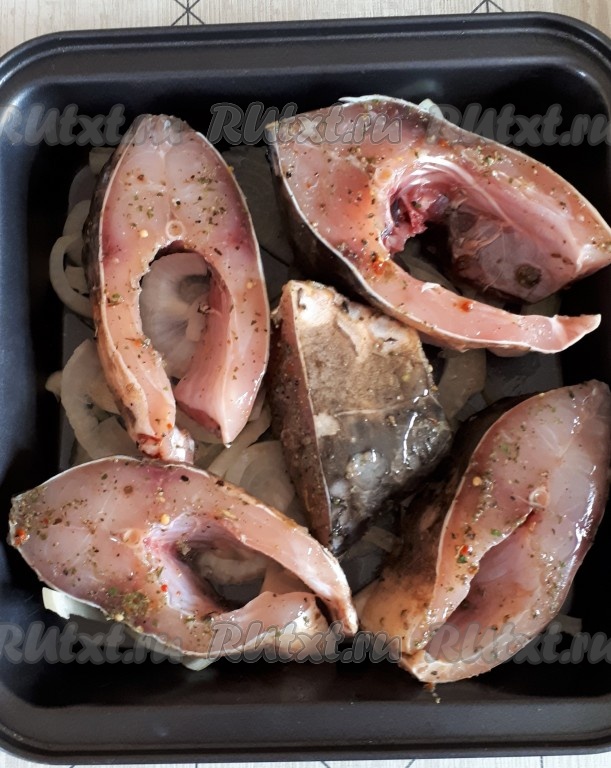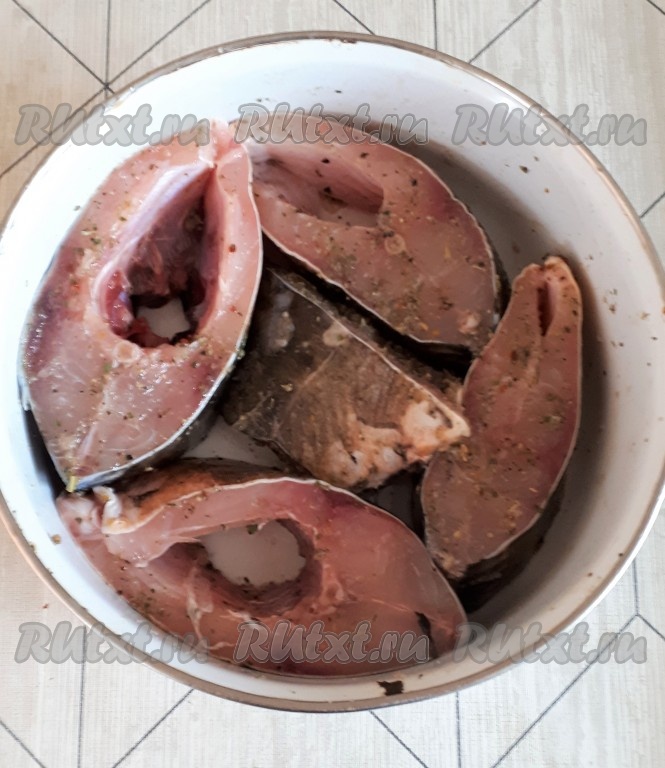 Кусочки карпа сбрызнуть соком лимона, посыпать специями, посолить и поперчить.
