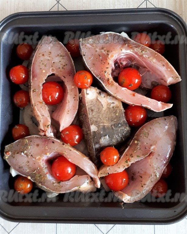 Сверху сбрызнуть рыбу оставшимся растительным маслом. Форму поместить в духовку, нагретую до 180 градусов, и запекать рыбку с овощами 30 минут. Вкусный, аппетитный карп, запечённый с луком и помидорами черри, готов.