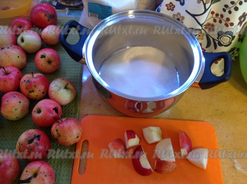На дно кастрюли насыпать немного сахара и выкладывать слоями нарезанные яблоки, предварительно вырезая все естественные повреждения и тёмные точки.