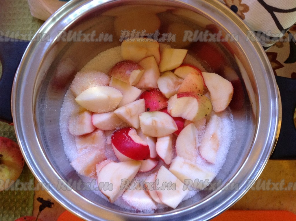Верхним слоем должен быть сахар. Закрыть кастрюлю с яблоками и сахаром крышкой и оставить на несколько часов (или на ночь), пока яблочки не дадут сок.