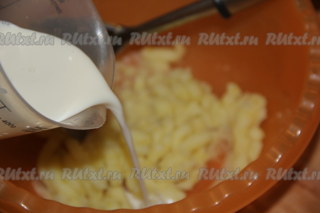 Влить тёплое молоко в миску к картофелю и тщательно перемешать.