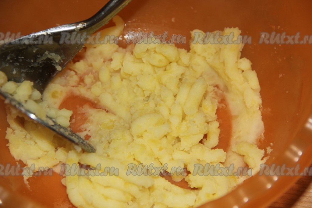 Очищенную картошку отварить в течение 20-25 минут (до готовности), выложить в миску и размять толкушкой. Для приготовления блинчиков потребуется 200 грамм варёной картошки.
