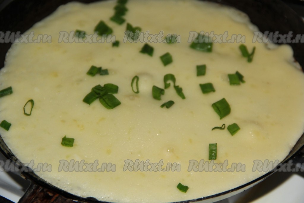 Посыпать блин нарезанным зелёным луком (или другой зеленью). Жарить картофельный блинчик на среднем огне до золотистого цвета с одной стороны.