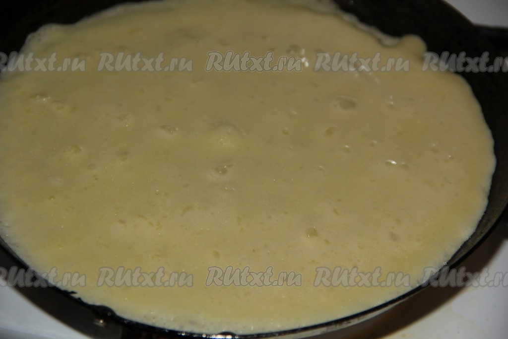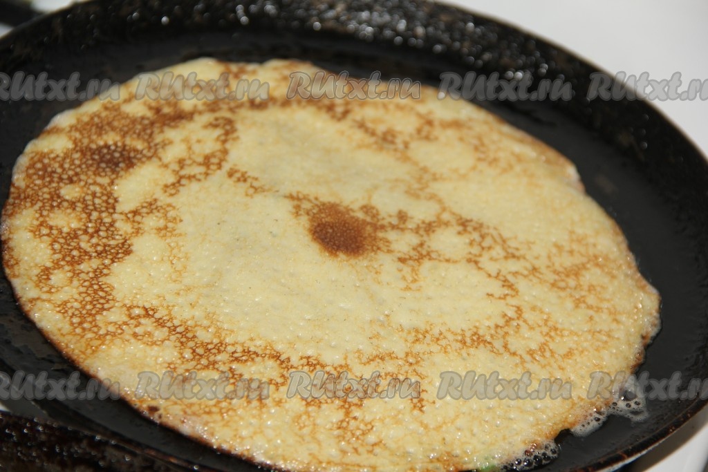Затем перевернуть и жарить с другой стороны до золотистого цвета. Таким образом пожарить все блинчики.