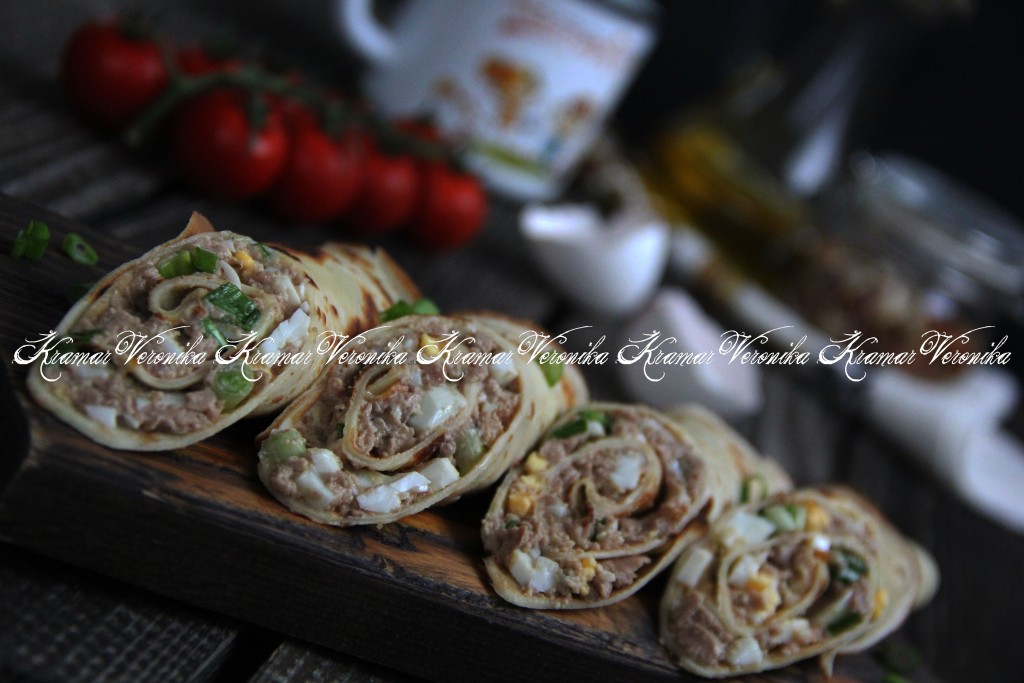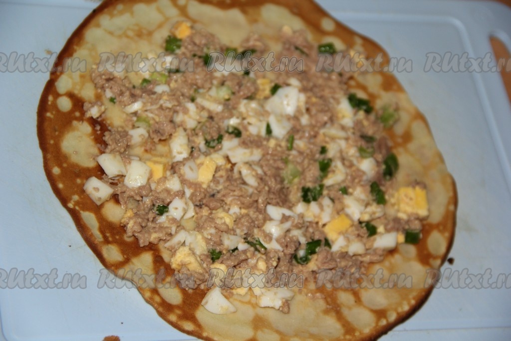 Завернуть блин в плотный рулет. Из указанного количества ингредиентов для начинки у меня получилось 4 блина диаметром 24 см с начинкой из печени трески и варёных яиц.