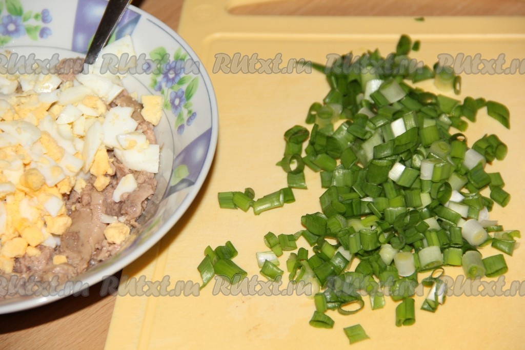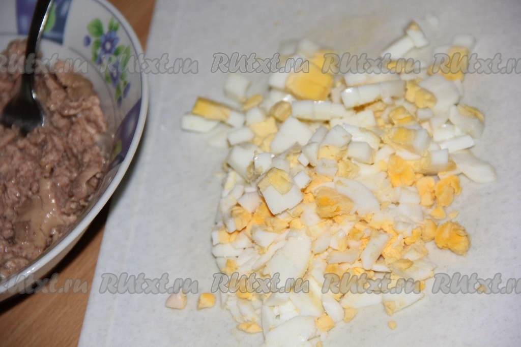 Яйца предварительно сварить вкрутую (варить минут 10 с момента закипания воды), остудить, очистить от скорлупы и мелко нарезать.