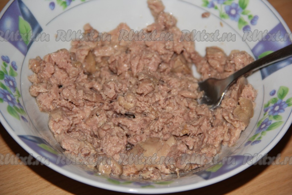 Теперь займёмся начинкой для блинов. Печень трески без масла переложить в глубокую миску и размять вилкой.