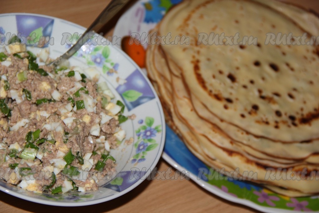 Блины с печенью трески получаются очень вкусными, нежными и сытными. Их можно легко сформировать, завернув начинку в блинчик в виде рулета и нарезав его на кусочки, и подать в качестве холодной закуски. Блины можно приготовить по любому рецепту. Я же предлагаю использовать блинчики, замешанные на молоке. Блины, приготовленные по этому рецепту, получаются тонкими, эластичными, они прекрасно сочетаются с начинкой из печени трески. Блинчиков из указанного количества ингредиентов получилось много. Четыре блина диаметром 24 см подала с начинкой, а остальные съели с вареньем и сметаной. Закуска из блинчиков с печенью трески понравится многим, попробуйте!