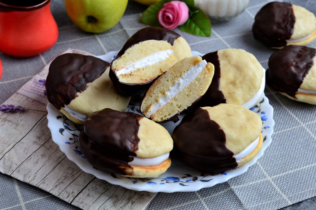 Наверное многие видели и покупали в магазине мягкое печенье в шоколаде с белоснежной прослойкой под названием "Чокопай" ("Choco-pie") и знают, что оно очень вкусное, но вместе с тем и достаточно дорогое. Хочу предложить вам приготовить замечательное печенье "Чокопай" в домашних условиях. Готовятся эти печенюшки несложно, получаются нежными, мягкими и вкусными - отличная выпечка к кофе или чаю. Из данного количества продуктов у меня получилось 10 чокопаев диаметром около 5-6 см (можете сделать их поменьше). Приготовьте домашнее печенье "Чокопай" и убедитесь в том, что оно получается даже лучше и вкуснее покупного!