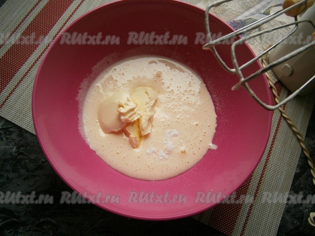 Далее добавить ванилин и предварительно размягчённое до комнатной температуры сливочное масло.