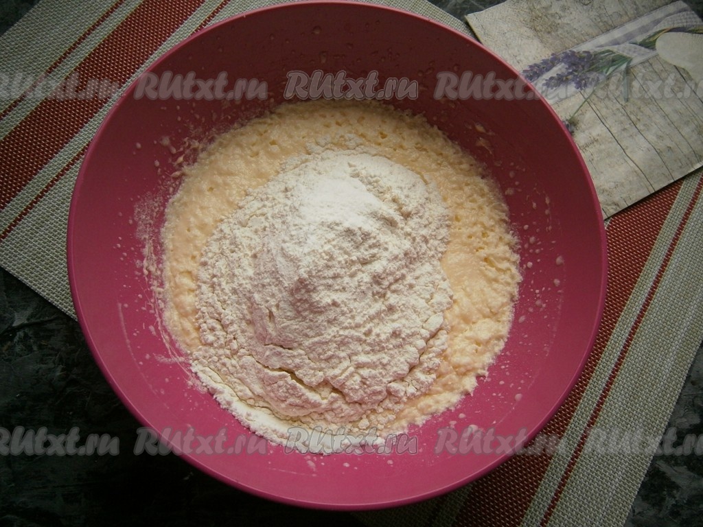 Всыпать частями муку, просеянную с разрыхлителем, замешивая ложкой тесто.