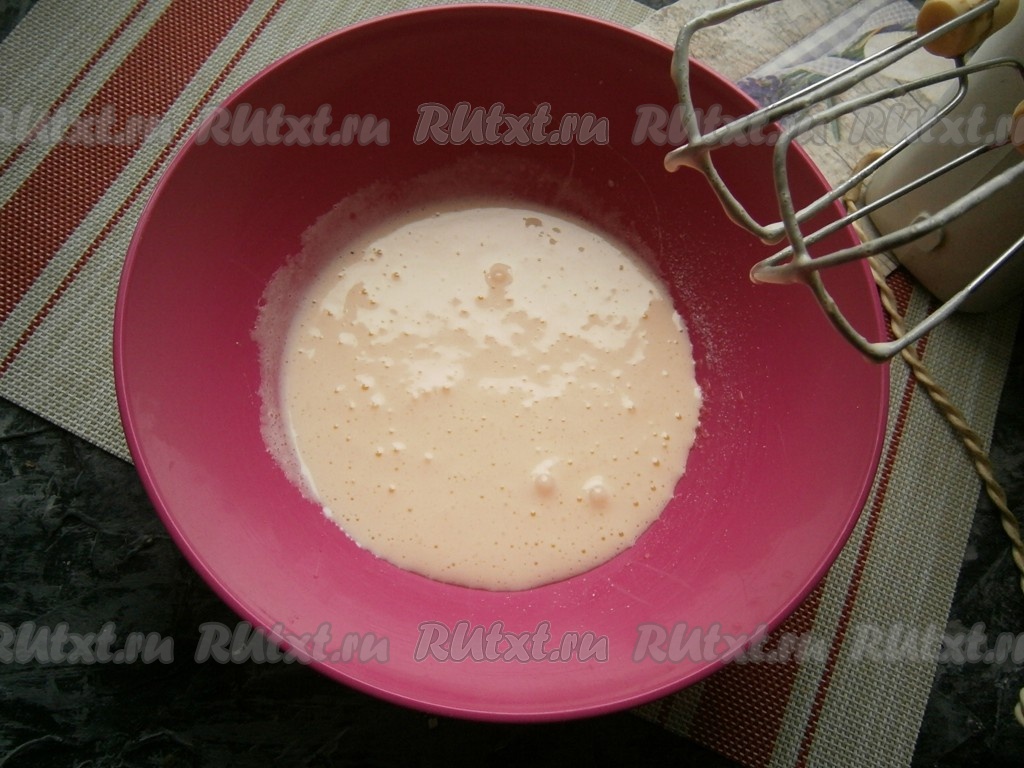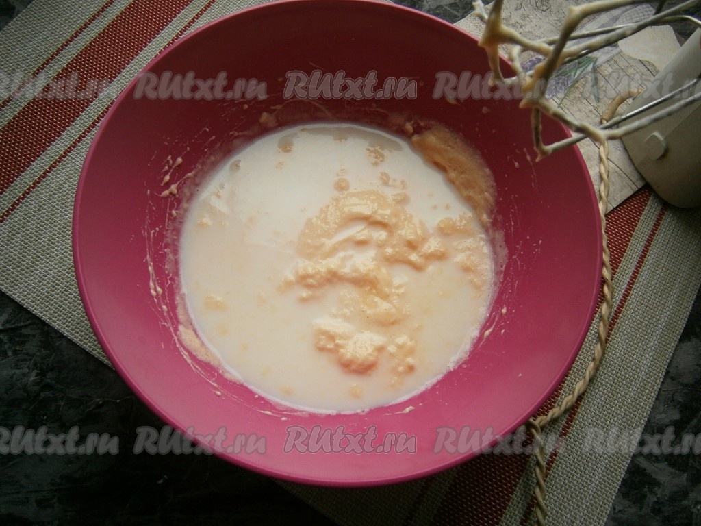 Получившуюся массу тоже взбить до однородности, затем влить молоко комнатной температуры, миксером смешать все ингредиенты.