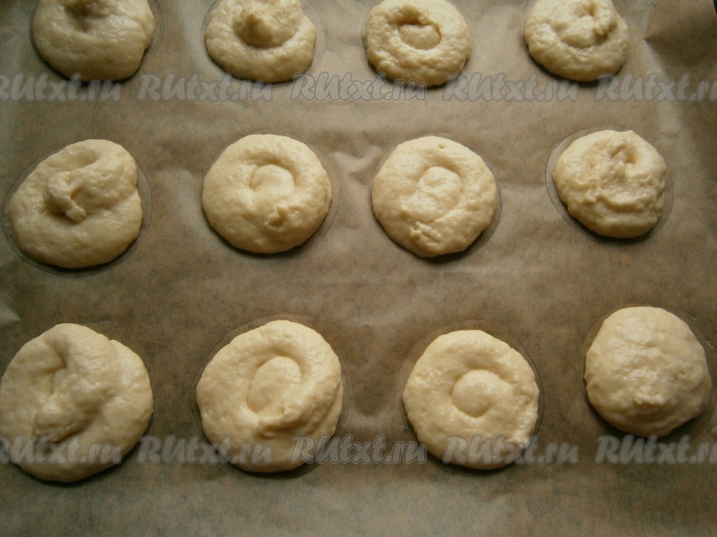 Тесто переложить в кондитерский мешок с обрезанным кончиком. На пергаменте желательно нарисовать кружочки нужного вам диаметра, чтобы печенюшки получились одинаковыми. Отсадить тесто в виде кружков на противень, застеленный пергаментом.