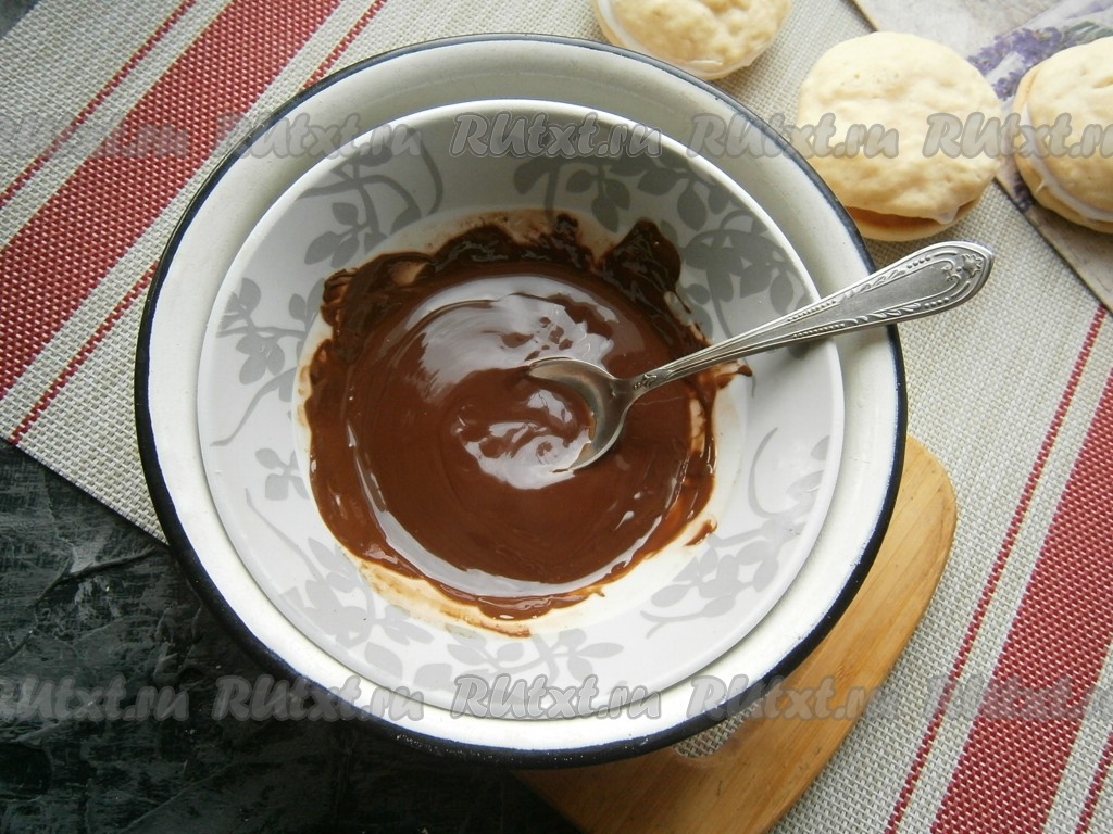 Для приготовления глазури шоколад растопить на водяной бане (или в микроволновке), добавить растительное масло и тщательно перемешать.