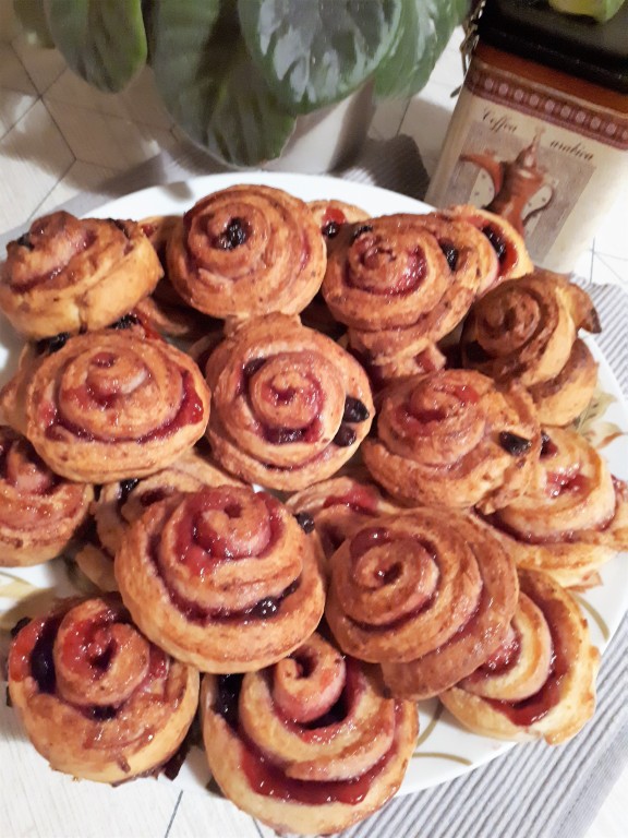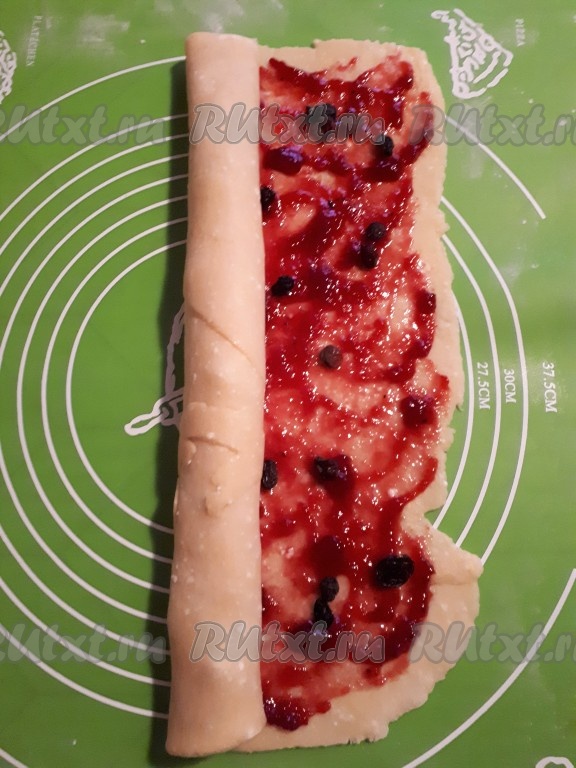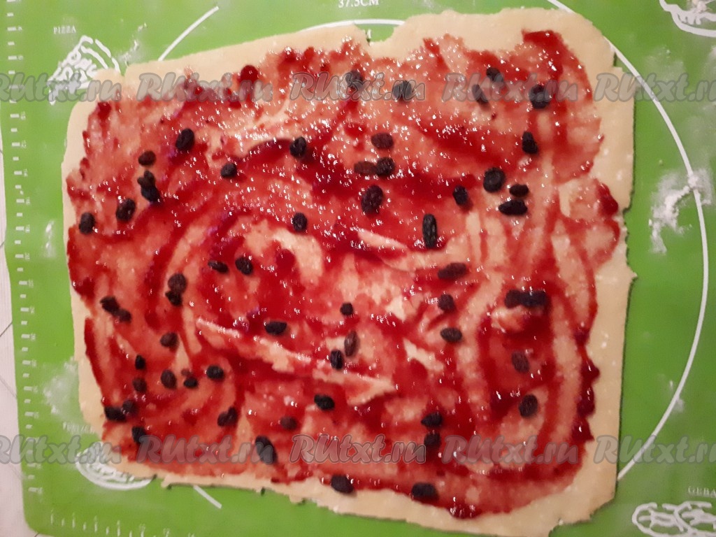 Смазать пласт теста джемом (у меня желе из чёрной смородины) и посыпать изюмом.