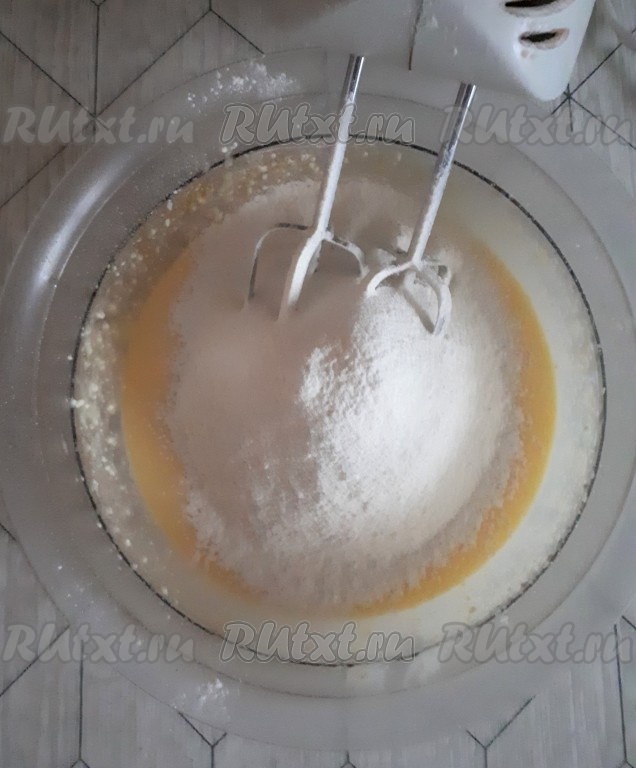 Добавить просеянную с разрыхлителем муку. Желательно сначала всыпать часть муки и перемешать смесь миксером, а затем добавить остальную. Мука бывает разная, её может понадобиться больше или меньше, поэтому нужно ориентироваться по консистенции теста.
