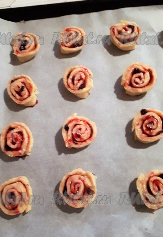 Подготовленные кусочки выложить на противень, застеленный пергаментом, срезом вверх, в виде "улиточек" на некотором расстоянии друг от друга. Аналогично сформировать "улитки" из второй части творожного теста и тоже выложить на застеленный противень.