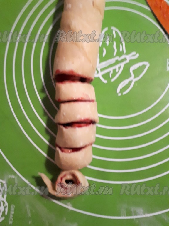 Нарезать рулет на кусочки шириной 2 см.