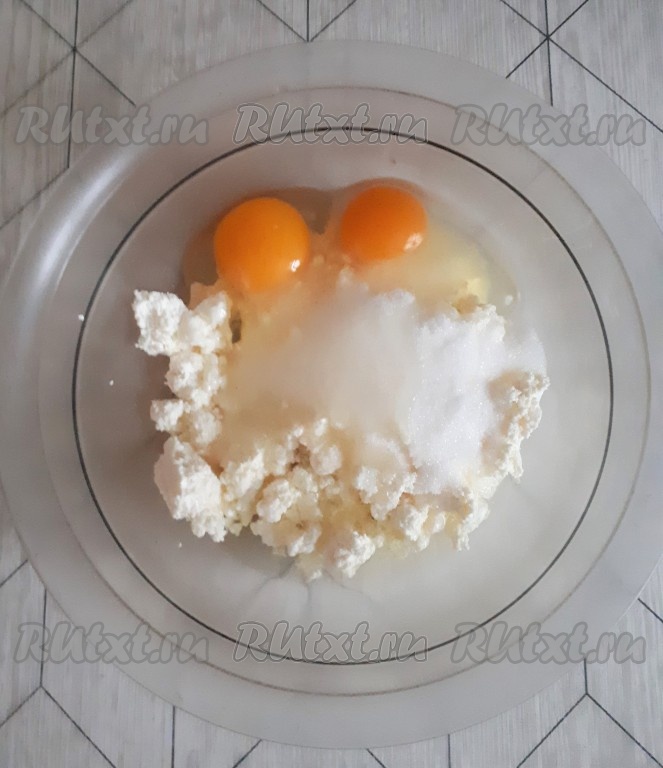В миске соединить творог, яйца, растительное масло и сахар, взбить миксером.