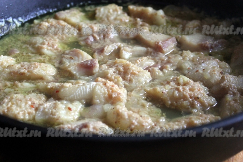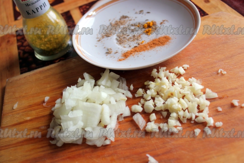 На слабом огне на растительном масле обжарить мелко рубленный лук и чеснок со всеми специями и пряностями.