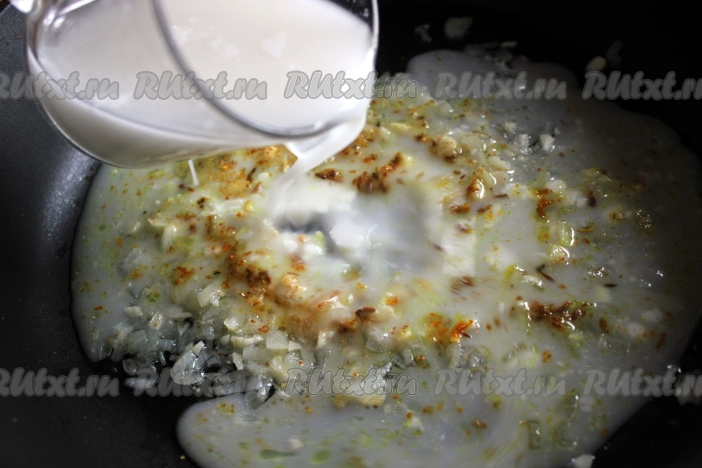 Влить к ароматному маслу со специями кокосовое молоко и потушить 1 минуту.