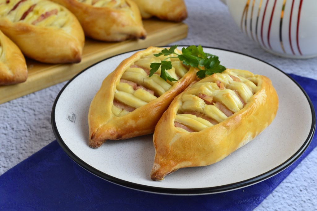 Необычайно красивые и очень вкусные пирожки, приготовленные с ветчиной и сыром из дрожжевого теста, немного остудить и можно подавать к столу.