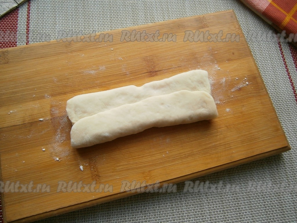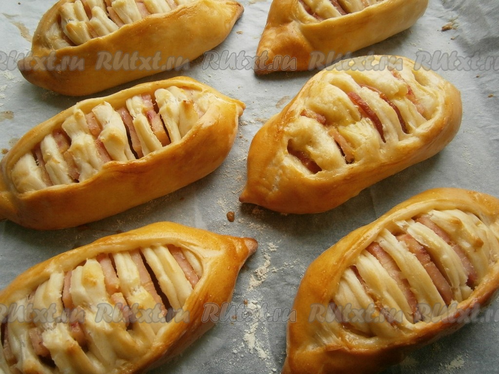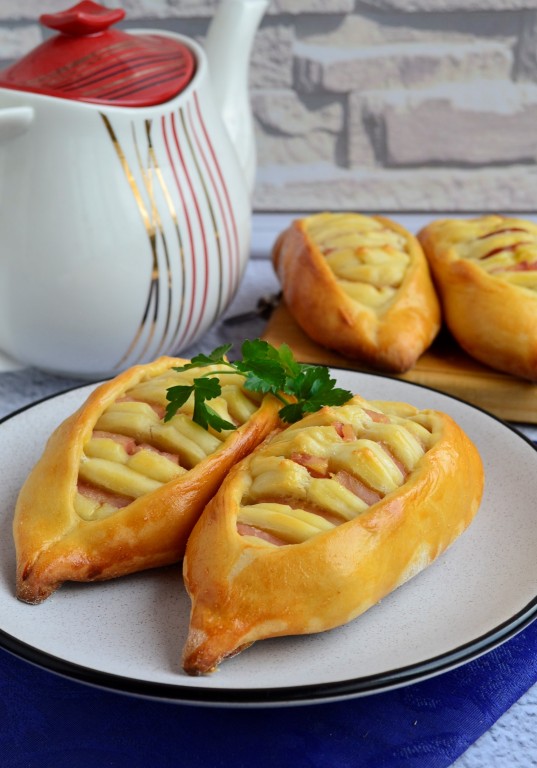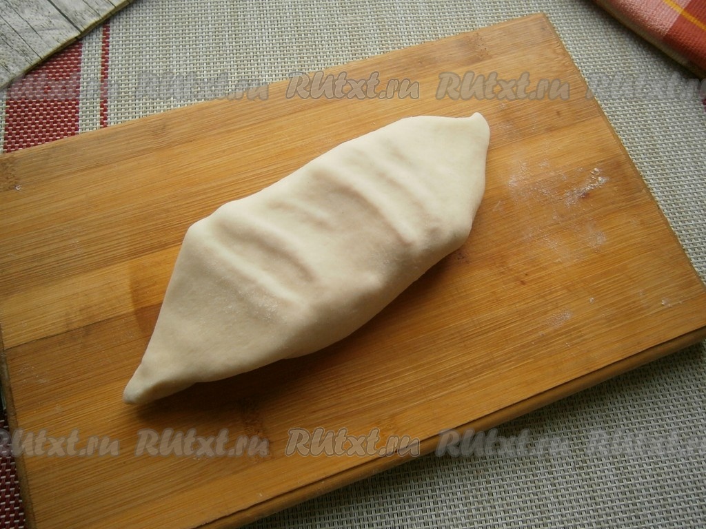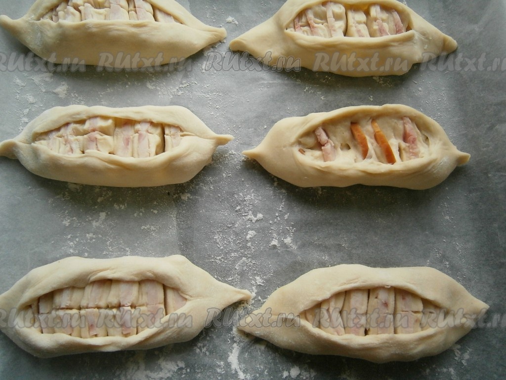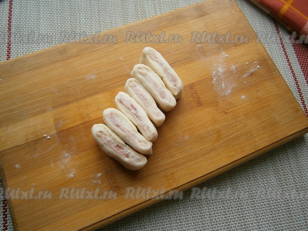 Немного пирожок придавить и сделать продольный разрез острым ножом, но не до самых краёв. Руками приоткрыть тесто, чтобы начинка из теста с ветчиной была хорошо видна. Сыр окажется внизу пирожка.